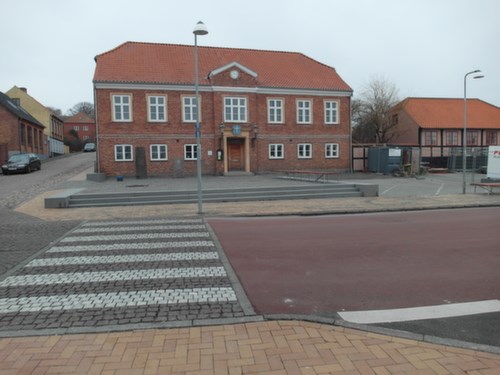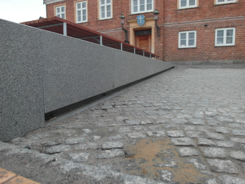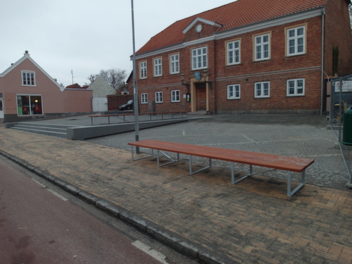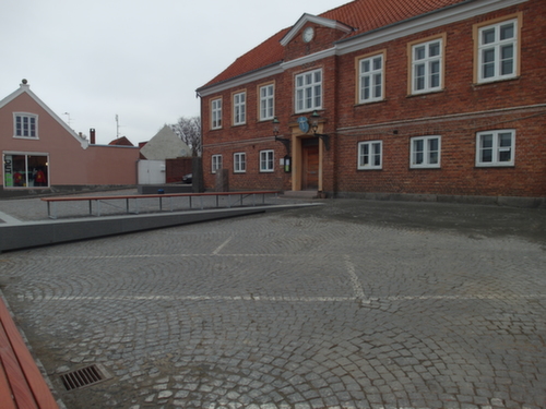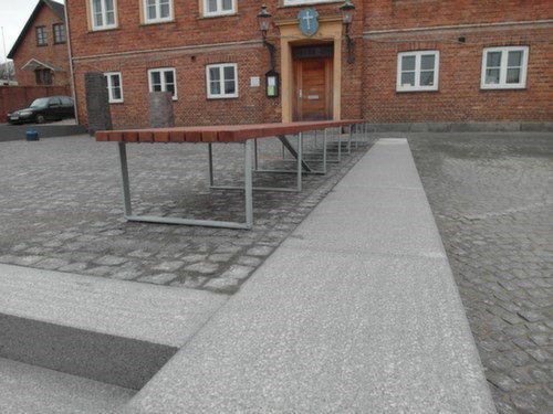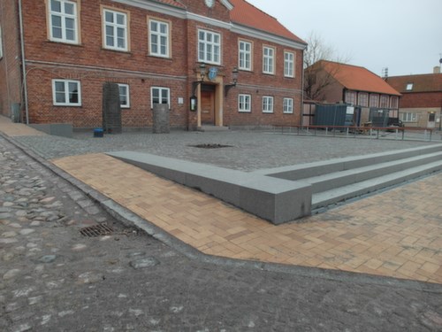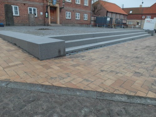 Torvet omkranses af granitplinte og en ny 11 m bred granit trappe i Blå Rønne Granit.