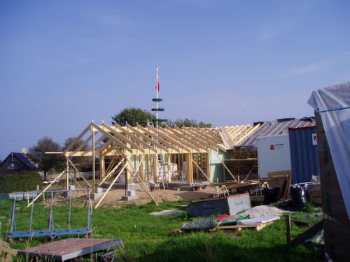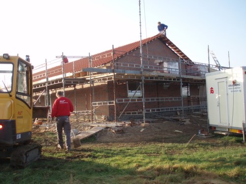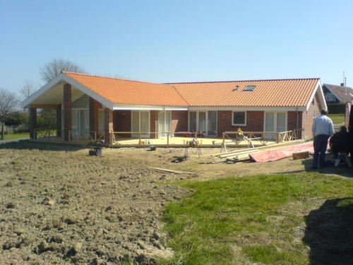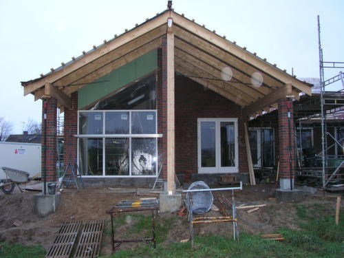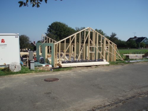 Huset er opført i lette bagvægge med skalmur og tegltag.