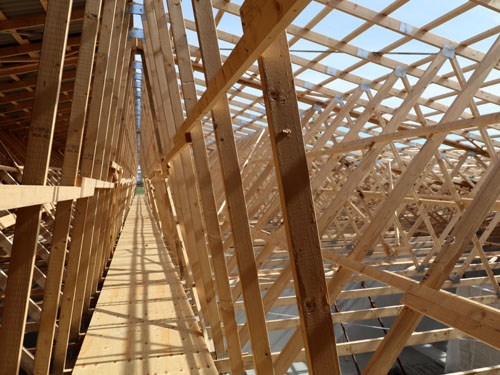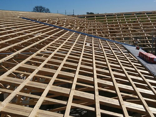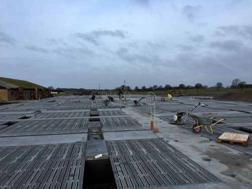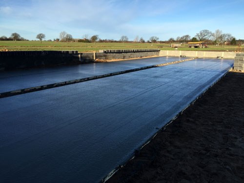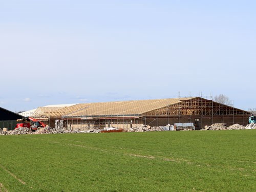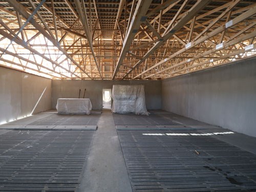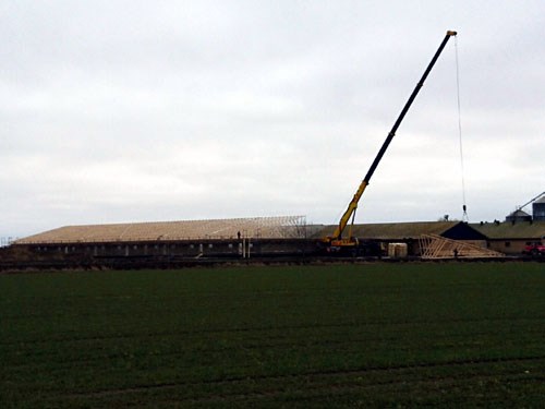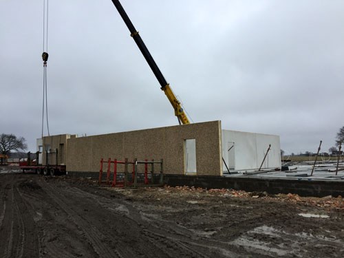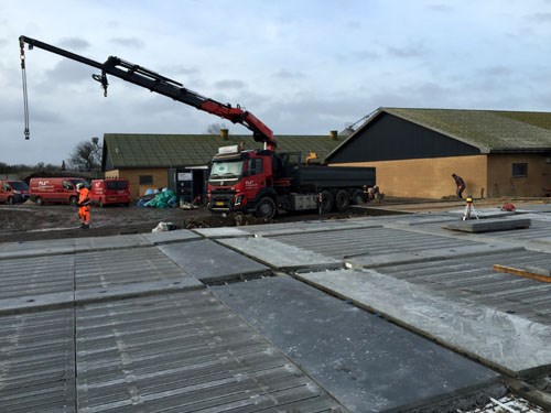 Slagtesvinestald udføres med facader som præfabrikerede betonsandwichelementer, tag som 15 gr. eternit og loftkonstruktion med træbeton.