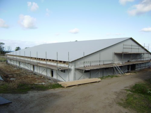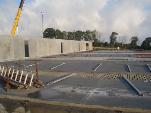 Smågrise- og farestald udført med facader som præfabrikerede indfarvede betonsandwichelementer, tag som 15 gr. stålpladetag og loftkonstruktion med træbeton og diffus ventilation.