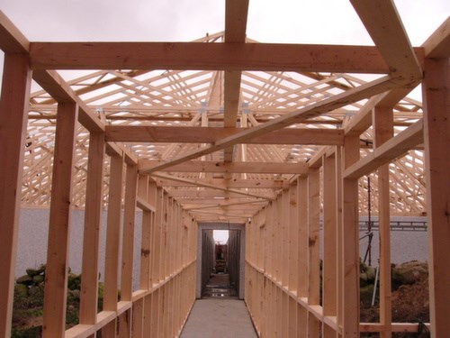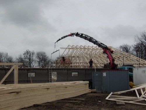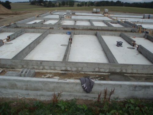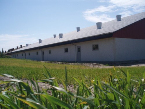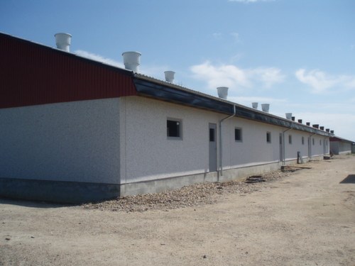 Smågrisestald udført med facader som præfabrikerede indfarvede betonsandwichelementer, tag som 15 gr. eternittag og loftkonstruktion med træbeton og diffus ventilation.