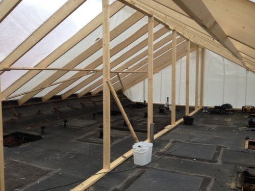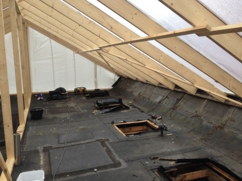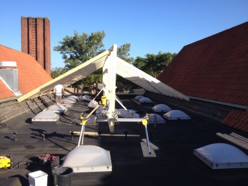 Nyt paptag over svømmehallen omfatter, nyt pap - 9 stk. ovenlys kupler, montering af fugt måle rundeller incl. airlift hætte, samt murkrone og ventilationshus m.m.