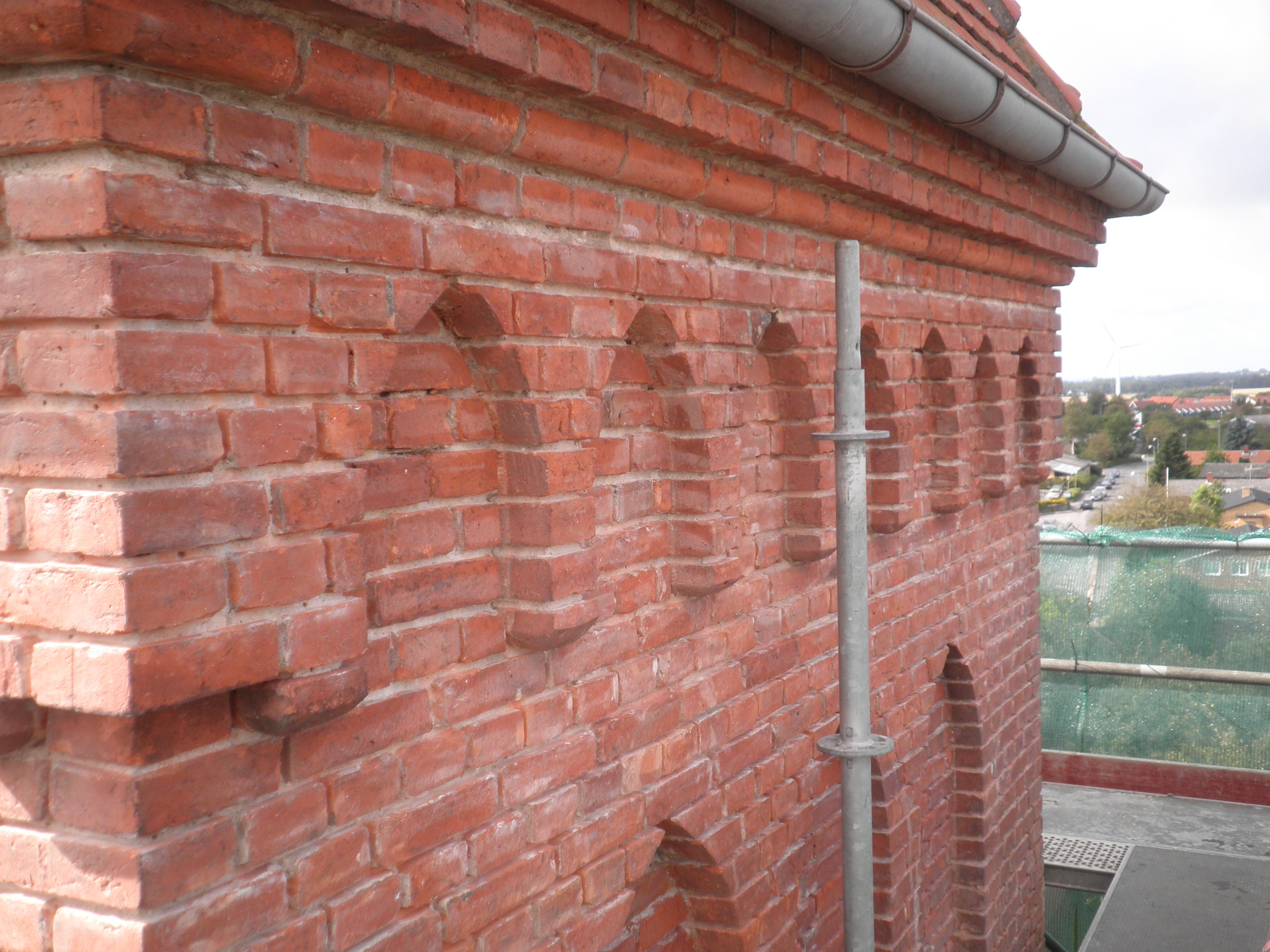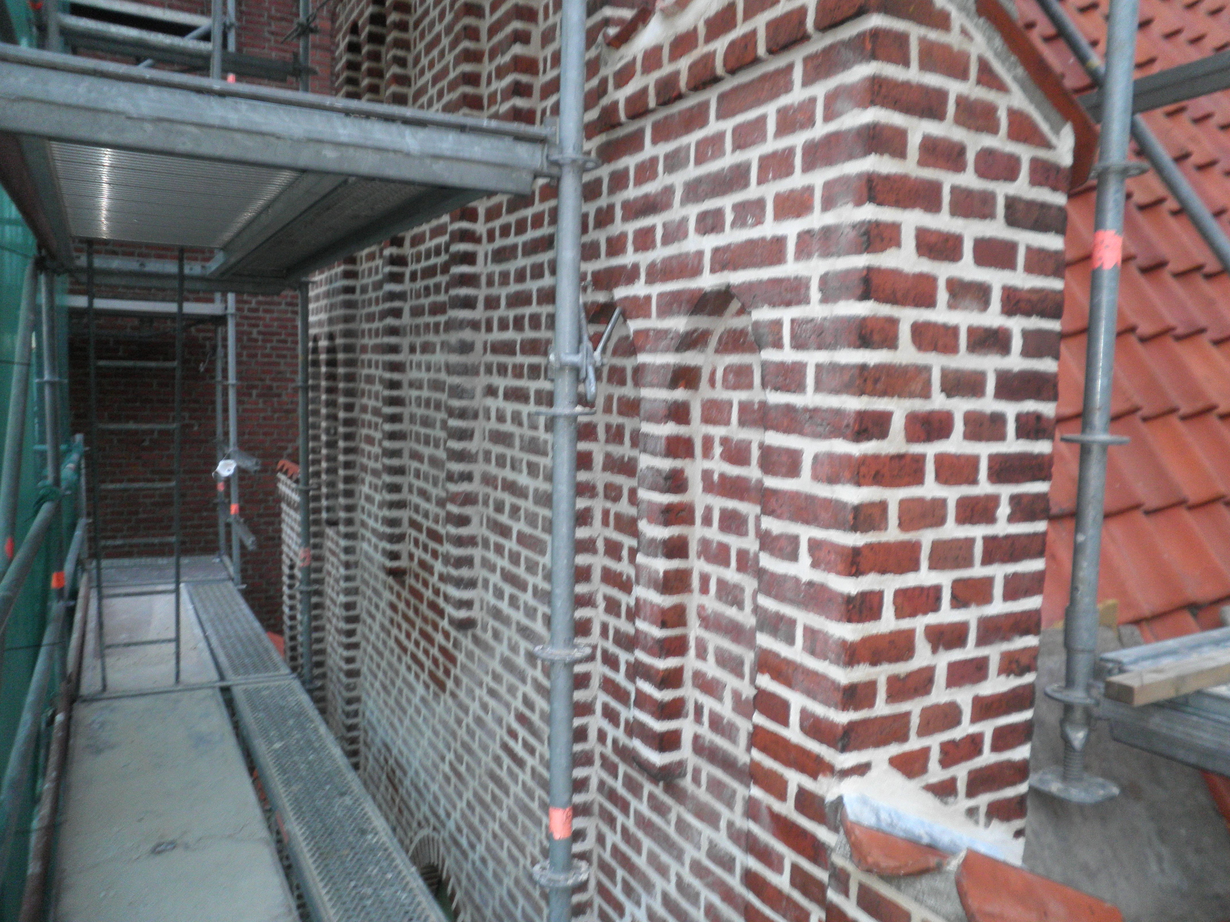 Udkradsning og fugning på gavl og tårn. Fugearbejdet er udført med juramørtel uden brug af cement.